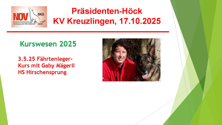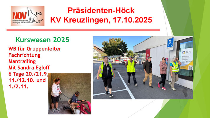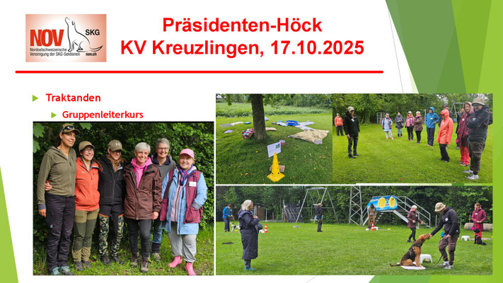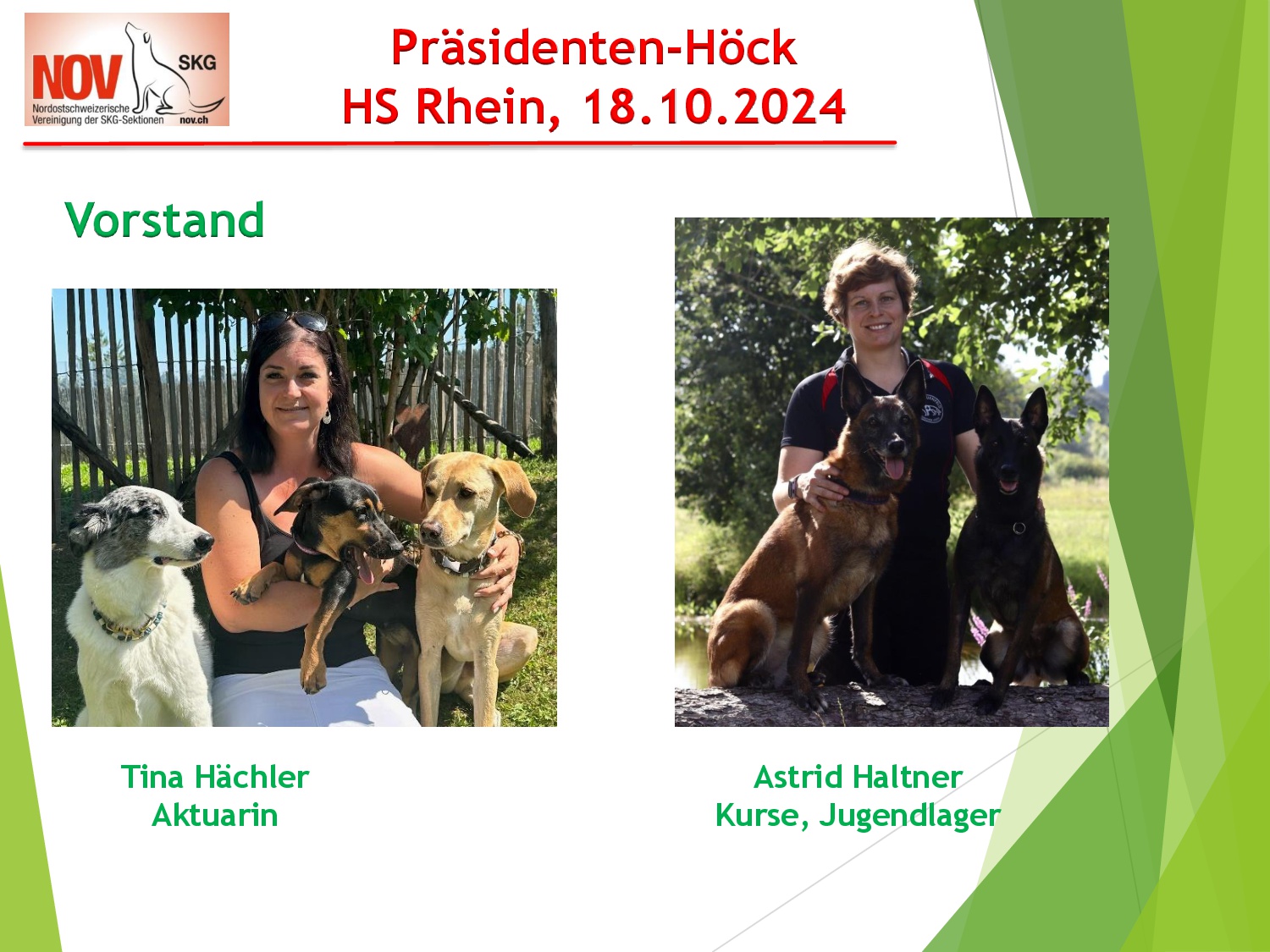 In einem kurzen Rückblick auf das laufende Jahr erwähnte Gerda die durchgeführten Anlässe – DV, Lawinenhunde-SM im Toggenburg, Gruppenwettkampf beim KV Schaffhausen – und freut sich, dass das grosse Kursangebot gut genutzt wurde. Sie macht darauf aufmerksam, dass diverse Nachfolger im Vorstand gesucht werden. Die Vereinsvertreter/innen werden aufgerufen, geeignete Personen für das Präsidium und das Kurswesen vorzuschlagen. Tina Hächler konnte bereits als Aktuarin gewonnen werden, da Max Hulliger aus zeitlichen Gründen, das eben angetretene Amt wieder niederlegen musste.
