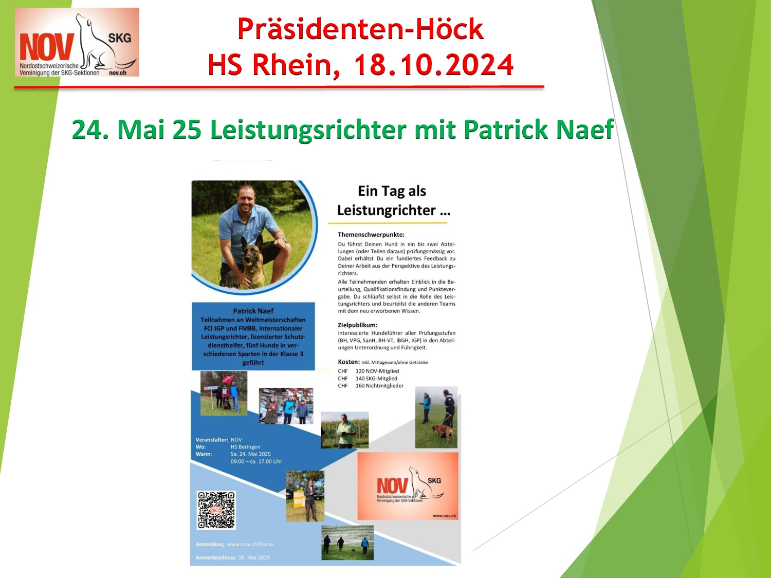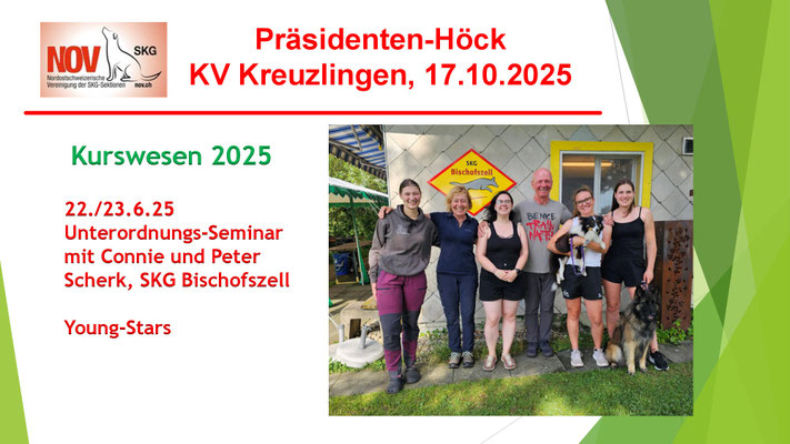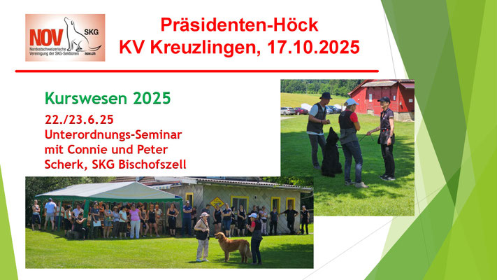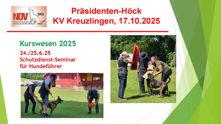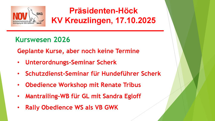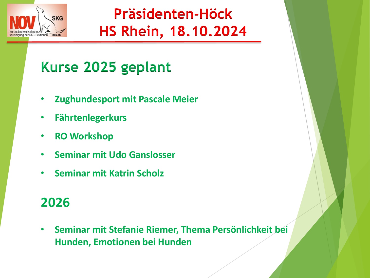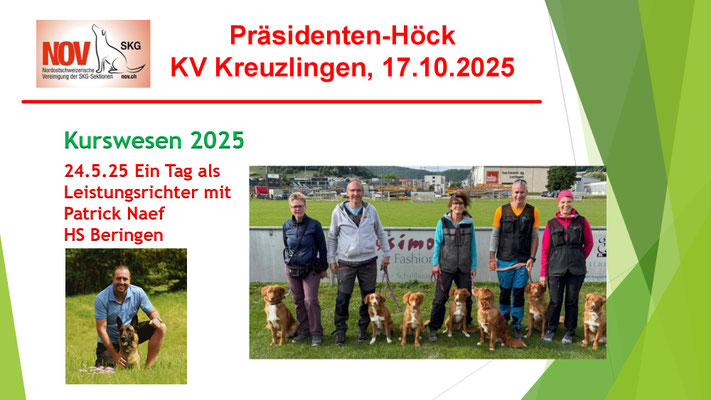 Für 2024 sind bereits einige Kurse in diversen Sparten geplant. Michi Achermann freut sich, dass der KVF am 9. Dezember 23 die NOV Meisterschaft durchführen wird und hofft auf viele Anmeldungen, speziell in VPG. Der Gruppenwettkampf wird am 9. Juni vom KV Kreuzlingen durchgeführt, jedoch fehlt noch ein Organisator für die Meisterschaft 2024.