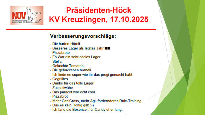 In einer vollen Klubhütte des KVF konnte Gerda Messmer, Präsidentin der NOV, die Präsidenten oder Stellvertreterinnen einiger NOV Vereine, Heiri Brunner des ZHV, sowie 10 Gruppenleiterinnen und ein Gruppenleiter des GL-Kurses 22/23 begrüssen. Leider musste sich Pascal Ambass, neuer Leiter des Jugendlagers, krankheitshalber abmelden.
